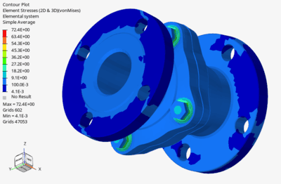 The simulation utilizes CAD files of both sides of the valve casing flanged together via four model screws. The screws feature a structured hexahedral mesh, while the casing is discretized with a free tetrahedral mesh. Through the exact modeling of all components, we can account for their unique geometries, whereas calculation standards can only factor in shapes through integrated model scalar stiffnesses, resulting in restrictive input data for connection evaluation. Garbage in, garbage out.